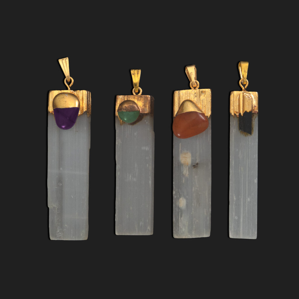Aunque la selenita es un mineral blando (dureza 2 en la escala de Mohs), su uso en joyería ha crecido exponencialmente gracias a su belleza traslúcida.
