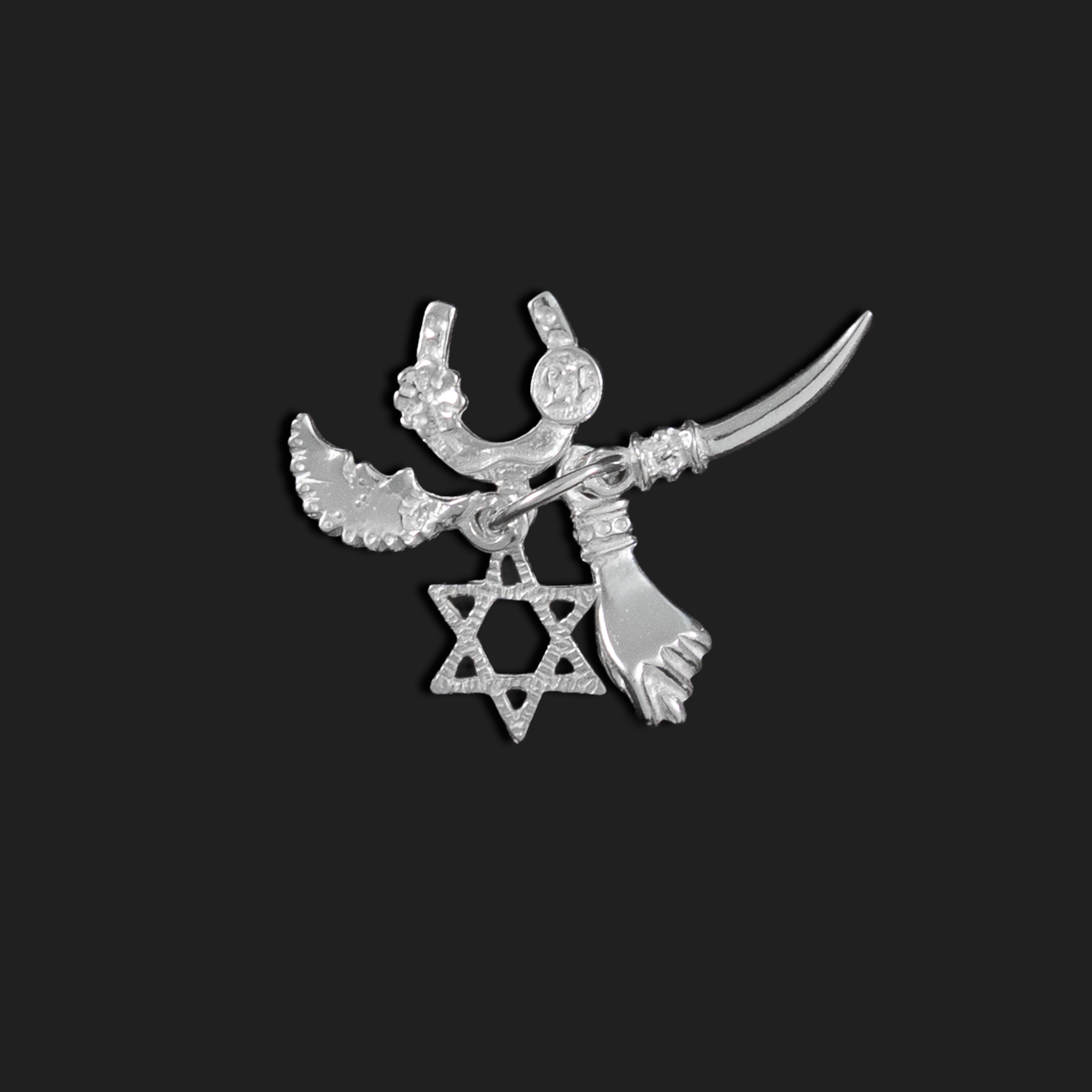 Colgante Multitalismán (5 Poderes) Lleva la máxima protección contigo. Este colgante combina 5 amuletos esenciales en una sola pieza: la Higa (contra el mal de ojo), la Herradura con el 13 y trébol (buena suerte), la Estrella de David (protección divina), la Luna (intuición) y el Colmillo (fuerza y defensa).