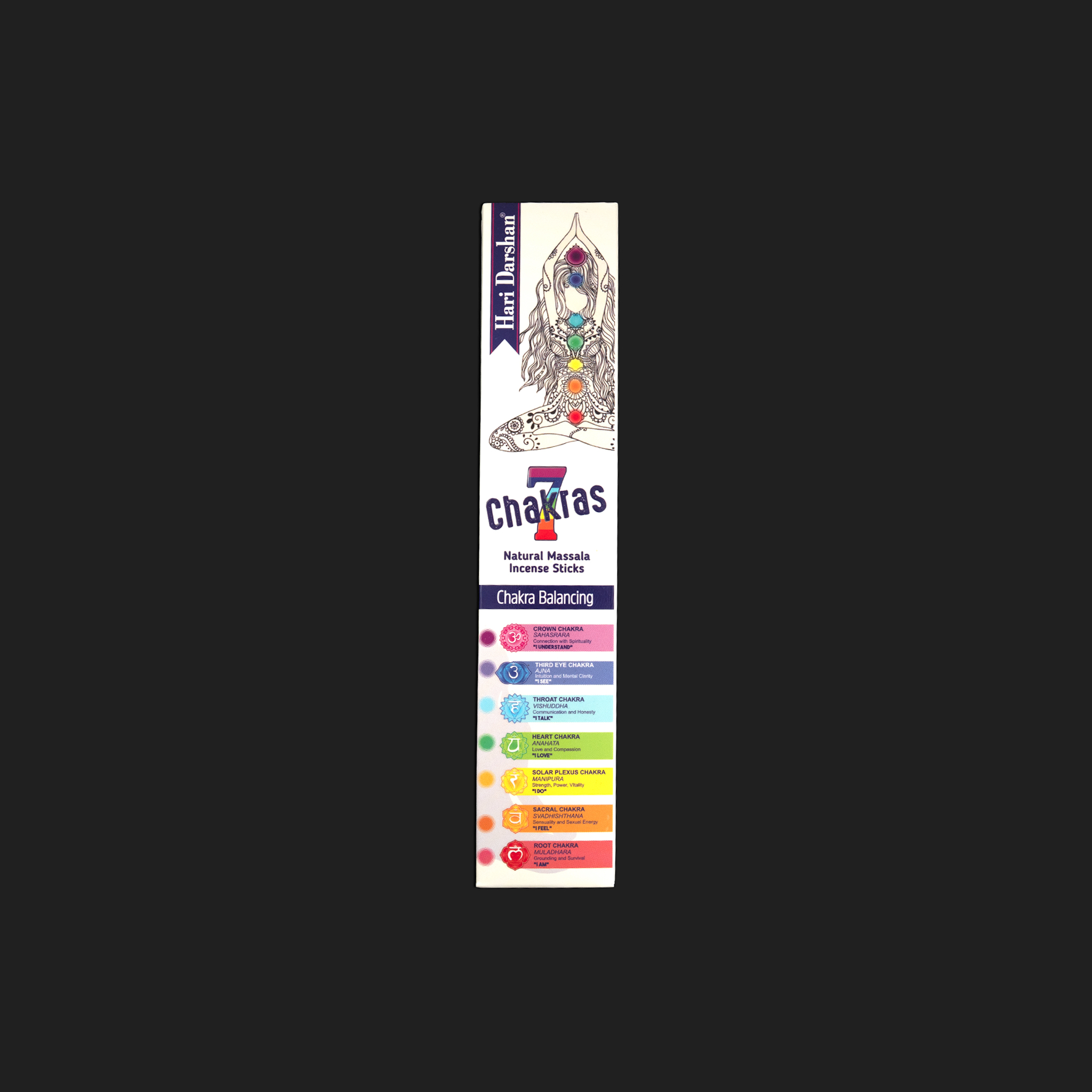 El propósito de este incienso es trabajar sobre el sistema de los 7 chakras principales, los vórtices de energía que recorren nuestra columna vertebral. Su aroma complejo y multifacético actúa como una llave maestra que busca y disuelve los bloqueos en cada nivel: